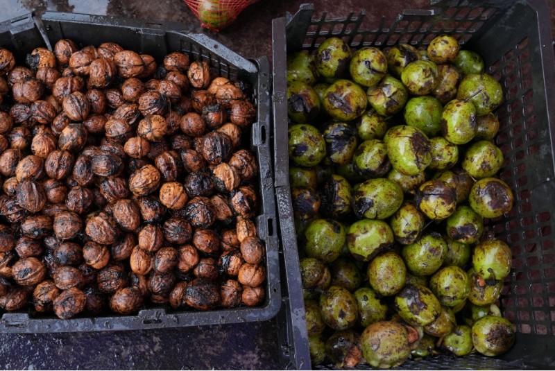 當(dāng)季的新鮮核桃,是制作核桃撒的靈魂所在。帶皮的鮮核桃從樹上摘下,褪去青皮,扒掉褐色的薄膜,剝出嫩白如玉的核桃仁。