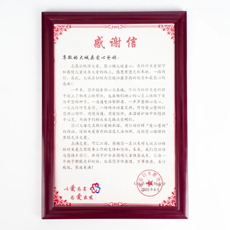 4月10日,大城縣婦聯(lián)年度工作推進(jìn)會暨“愛心爸媽”志愿服務(wù)品牌活動點(diǎn)亮儀式圓滿舉行,檀錦閣受邀出席,并被正式授予“大城縣愛心爸媽志愿服務(wù)聯(lián)盟-檀錦閣紅木志愿服務(wù)隊(duì)”稱號,同時還收到了一封飽含認(rèn)可的感謝信。