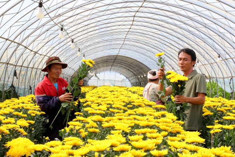 現(xiàn)代種植技術(shù)的引入,提高了菊花的產(chǎn)量和品質(zhì);線上銷售渠道的拓展,讓菊花隨著餐飲業(yè)走進了全國視野。為讓菊花四季綻放,每天都有鮮花供給城里的餐桌,萬江濤采取了更換品種和地塊輪番耕作的辦法。每年1至6月種金旭品種,7至12月種觀玉品種;菊花采摘后輪番換地塊栽種,這樣既做到地塊的休養(yǎng)生息,也保障了菊花的產(chǎn)銷問題。