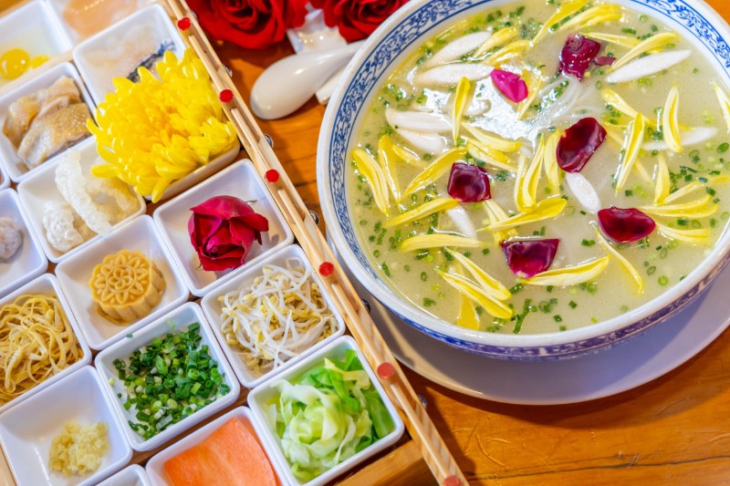 “餐菊”和“采菊”彰顯先賢高潔人品和淡泊情懷,如今的紅河哈尼族彝族自治州蒙自市,“餐菊”和“采菊”再現(xiàn)了當(dāng)代人的別樣生活情景。久負(fù)盛名的蒙自過橋米線,因靚湯里加入菊花而色香味倍增,菊花讓一道美食具有了靈魂。