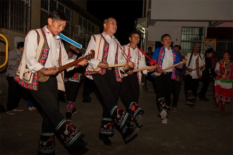 待夜幕降臨,(石咢)嘉集鎮(zhèn)上弦聲錚錚、歌舞飛揚(yáng),小鎮(zhèn)居民相聚廣場(chǎng),圍成一個(gè)圓圈,伴著悅耳的三弦聲,唱著“阿乖佬”踏歌起舞,歡聲笑語不停歇。