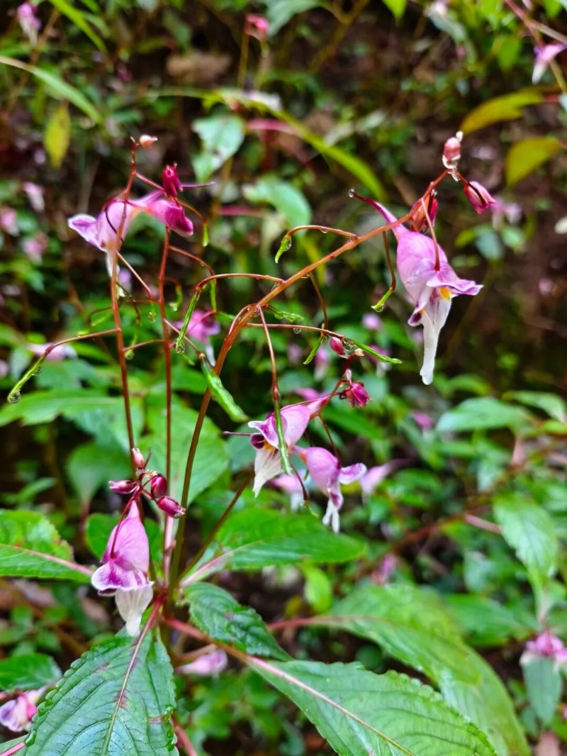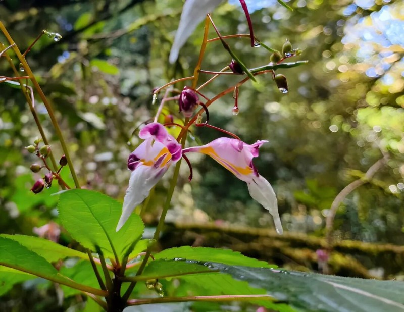 該物種屬于鳳仙花科鳳仙花屬的中國(guó)特有植物,滇水金鳳為一年生草本,莖粗壯肉質(zhì)、帶紅綠色,全株無(wú)毛;花呈粉紫色,花形為典型鳳仙花結(jié)構(gòu)(旗瓣、翼瓣、唇瓣),唇瓣下垂并延伸出內(nèi)彎的距;葉片為披針形,邊緣有鋸齒,葉柄基部有球形腺體;果實(shí)為紡錘形蒴果,成熟后輕輕觸碰會(huì)彈射種子,因此也被稱為植物界的“急性子”。