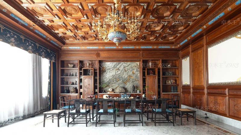 由卓木王紅木整裝落地的東陽3000㎡宮廷風(fēng)紅木整裝傳承祖宅茶室,以故宮建筑為靈感,緬甸柚木整裝、紫光檀家具,融入景泰藍(lán)、玉石等珍選材質(zhì),又加入東陽木雕、掐絲琺瑯等非遺工藝,盡顯宮廷氣象。