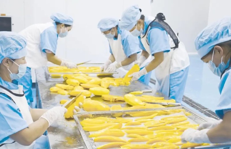 為有效應(yīng)對芒果集中上市帶來的銷售壓力與價(jià)格波動(dòng)風(fēng)險(xiǎn),破解產(chǎn)業(yè)發(fā)展瓶頸,中和鎮(zhèn)依托萬馬村委會(huì)閑置場地,申請專項(xiàng)項(xiàng)目資金高標(biāo)準(zhǔn)打造加工坊,并采用承租經(jīng)營模式進(jìn)行運(yùn)營。工人們精心挑選成熟度適中的新鮮芒果進(jìn)行清洗、削皮、切片、烘烤?!澳壳?,加工坊日均可處理鮮芒果400公斤,吸納4至6名附近村民就業(yè)。”加工坊負(fù)責(zé)人楊亞蕓介紹,“原料均從周邊果農(nóng)手中收購,加工過程嚴(yán)格遵循食品安全生產(chǎn)標(biāo)準(zhǔn),全程無任何添加劑,主打一個(gè)原生態(tài)。”