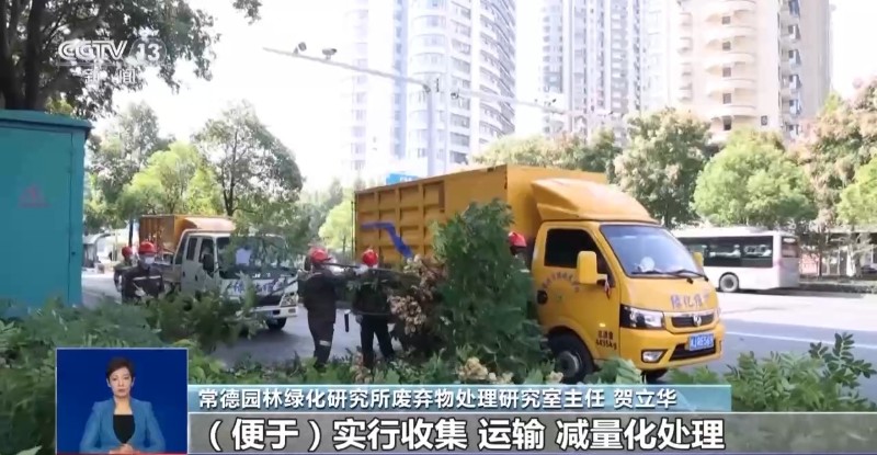 這些天,在湖南常德,養(yǎng)護工人正對路邊樹木進行整形修剪,修剪下來的枝葉被放入綠化垃圾粉碎車進行就地粉碎,每車可存儲約4噸的碎料。