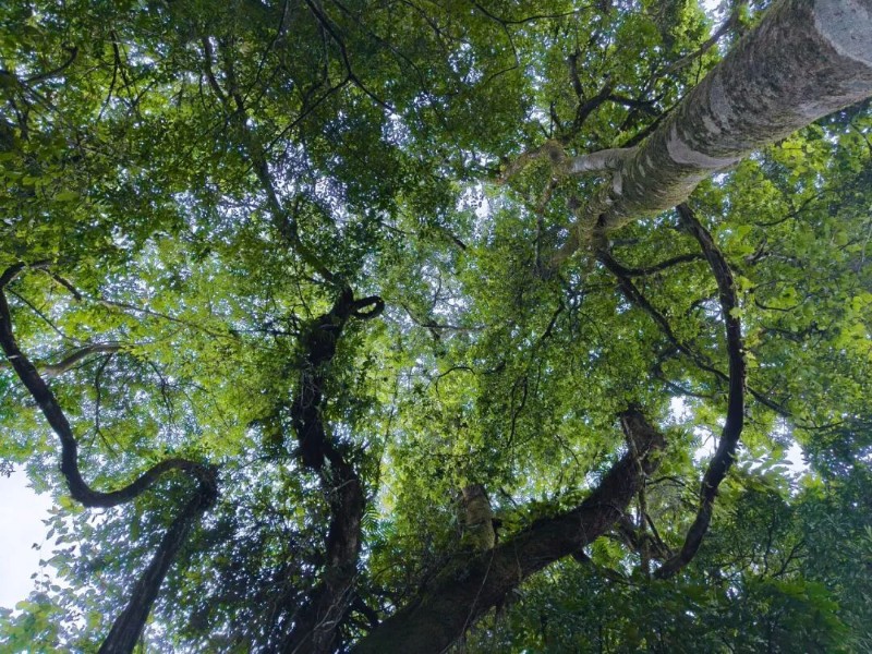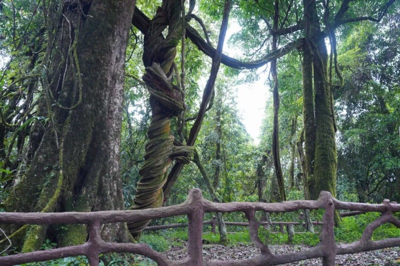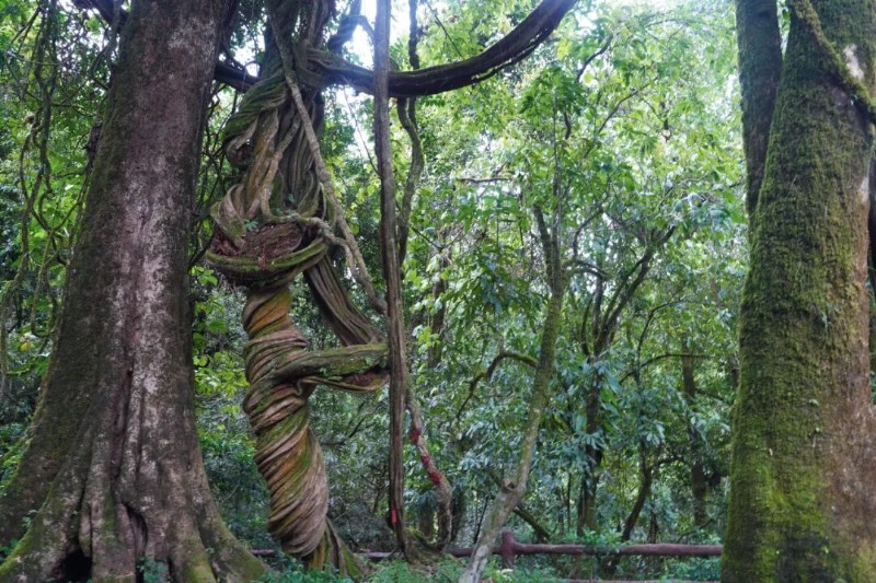 路是愈走愈幽深的,兩旁的原始叢林密不透風(fēng),蕨類的嫩碧與巨木的蒼綠交織纏繞,暈出一片幾乎要滴出水的濃翠,空氣里滿是植物蒸騰出的、帶著甜味的濕潤(rùn)。塵世的喧囂早被這層疊綠意濾成了虛無,只余下一種龐大無邊的靜——腐葉在腳下輕響,溪聲從蕨叢后漫來,飛鳥振翅的脆鳴,被這靜謐托著,格外清亮。此行,只為赴一場(chǎng)與昔馬鎮(zhèn)那株“千年血藤王”的時(shí)光約會(huì)。