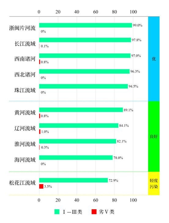 1—9月,長(zhǎng)江、黃河、珠江、松花江、淮河、海河、遼河等七大流域及西北諸河、西南諸河和浙閩片河流水質(zhì)優(yōu)良(Ⅰ—Ⅲ類)斷面比例為90.5%,同比上升0.5個(gè)百分點(diǎn);劣Ⅴ類斷面比例為0.5%,同比上升0.1個(gè)百分點(diǎn)。主要超標(biāo)指標(biāo)為化學(xué)需氧量、高錳酸鹽指數(shù)和五日生化需氧量。其中,浙閩片河流、長(zhǎng)江流域、西南諸河、西北諸河和珠江流域水質(zhì)為優(yōu);黃河、遼河、淮河和海河流域水質(zhì)良好;松花江流域?yàn)檩p度污染。