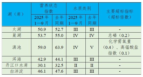 第三季度,監(jiān)測(cè)的209個(gè)重點(diǎn)湖(庫(kù))中,水質(zhì)優(yōu)良(Ⅰ—Ⅲ類)湖庫(kù)個(gè)數(shù)占比73.7%,同比上升6.4個(gè)百分點(diǎn);劣Ⅴ類水質(zhì)湖庫(kù)個(gè)數(shù)占比4.8%,同比上升0.5個(gè)百分點(diǎn)。主要超標(biāo)指標(biāo)為總磷、化學(xué)需氧量和高錳酸鹽指數(shù)。201個(gè)監(jiān)測(cè)營(yíng)養(yǎng)狀態(tài)的湖(庫(kù))中,中度富營(yíng)養(yǎng)的10個(gè),占5.0%;輕度富營(yíng)養(yǎng)的59個(gè),占29.4%;其余湖(庫(kù))為中營(yíng)養(yǎng)或貧營(yíng)養(yǎng)狀態(tài)。其中,太湖水質(zhì)良好、輕度富營(yíng)養(yǎng);巢湖為輕度污染、輕度富營(yíng)養(yǎng),主要超標(biāo)指標(biāo)為總磷;滇池為中度污染、中度富營(yíng)養(yǎng),主要超標(biāo)指標(biāo)為化學(xué)需氧量、高錳酸鹽指數(shù)和總磷;洱海水質(zhì)良好、中營(yíng)養(yǎng);丹江口水庫(kù)水質(zhì)為優(yōu)、貧營(yíng)養(yǎng);白洋淀為輕度污染、中營(yíng)養(yǎng),主要超標(biāo)指標(biāo)為溶解氧。