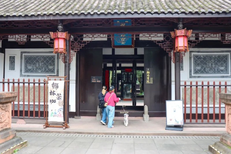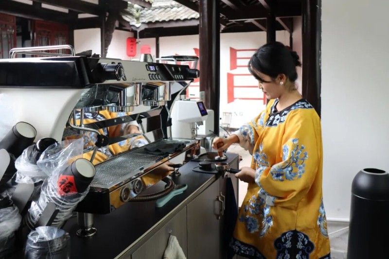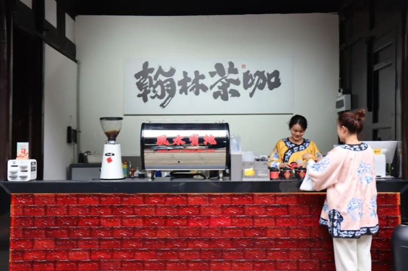 在唐昌鎮(zhèn)翰林書院內(nèi),木門、青石板與古風(fēng)“翰林茶咖”題字的場景里,一杯杯印有“郫縣豆瓣”的黑色咖啡杯格外醒目,不少游客手持咖啡打卡,感受翰林書院的書香墨韻。