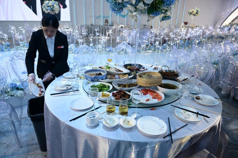 10月15日,在安徽合肥一處婚宴現(xiàn)場,賓客離去后桌上剩余大量餐食,有些盤中菜品幾乎未動,最終被倒入垃圾桶。