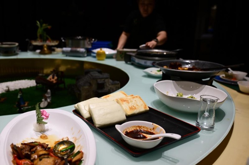 10月14日,在安徽合肥一家飯店內(nèi),服務(wù)員在顧客走后清理餐桌。桌上剩余的部分主食和菜品未被打包。