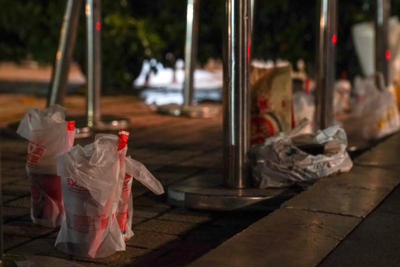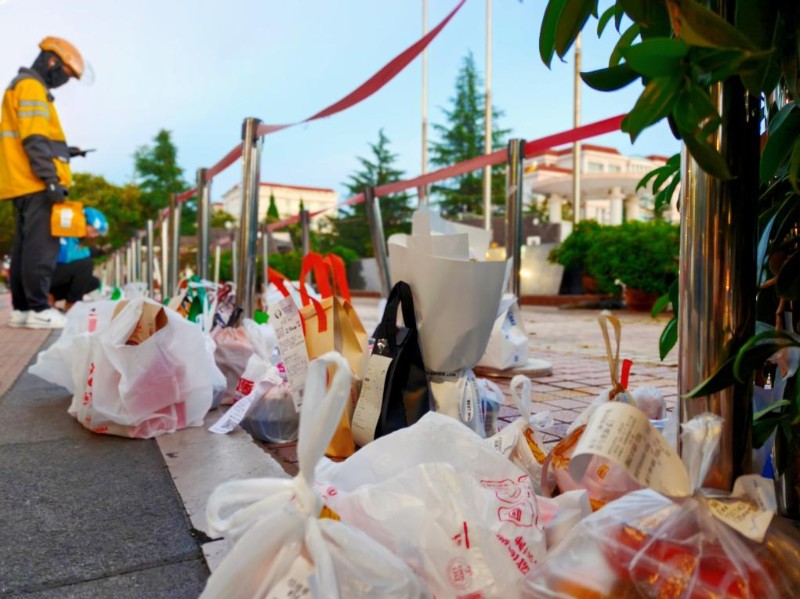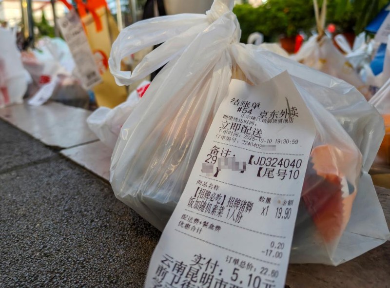 10月12日凌晨,在云南昆明某大學(xué)門口,外賣套餐中的部分小食、飲料被遺棄無人領(lǐng)取。