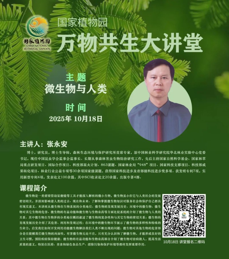 《萬(wàn)物共生大講堂》是國(guó)家植物園傾力打造的生物多樣性科學(xué)文化論壇,以“講好中國(guó)植物故事、傳播生物多樣之美”為宗旨,通過(guò)邀請(qǐng)植物、動(dòng)物、各類生物及生物多樣性研究等方面的專家,向公眾傳播科學(xué)文化知識(shí)。構(gòu)建一個(gè)生物多樣性跨界交流與植物科學(xué)文化思想持續(xù)發(fā)聲的公共空間,在專家和公眾之間架起一座溝通的橋梁,把“與自然共生、與萬(wàn)物共融”的五千年中華文明精神特質(zhì)傳播好,把生態(tài)文明思想宣傳好,推動(dòng)全民生物多樣性素養(yǎng)的提升,增強(qiáng)尊重自然、順應(yīng)自然、保護(hù)自然的意識(shí),為加快推進(jìn)人與自然和諧共生的現(xiàn)代化,全面推進(jìn)美麗中國(guó)建設(shè)貢獻(xiàn)力量。