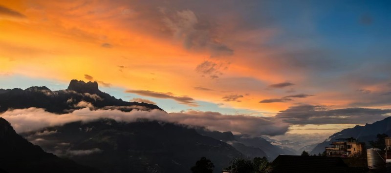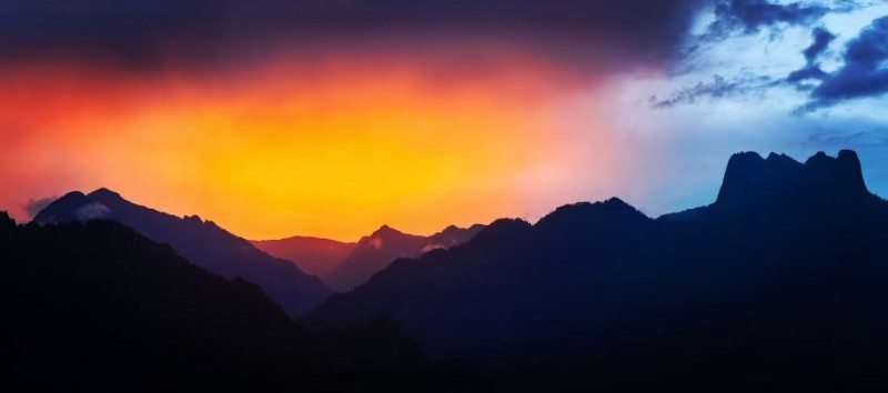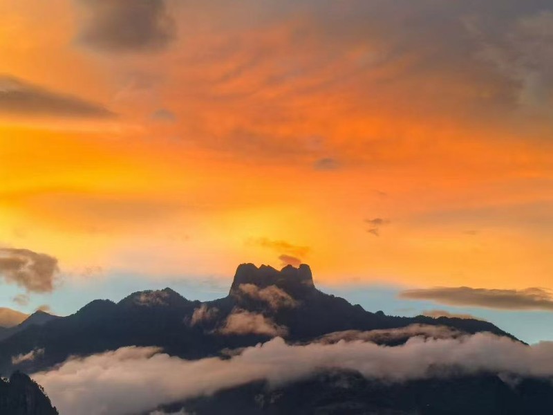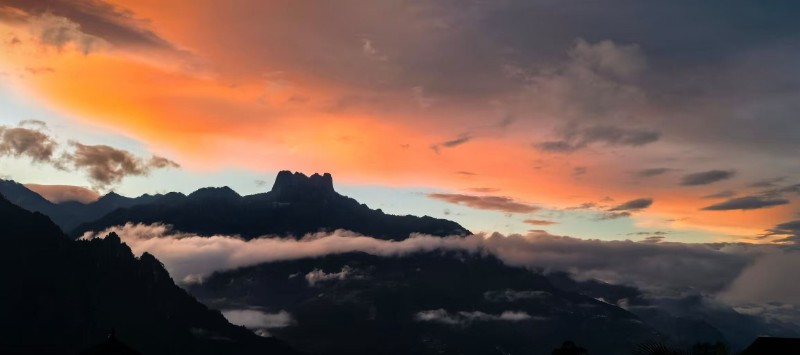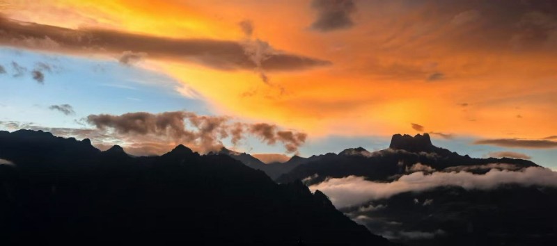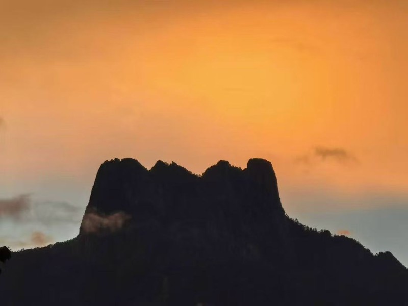 晚霞是打翻了的陳釀,潑灑在皇冠山起伏的脊線(xiàn)上。山峰飲了光,輪廓漸漸柔軟,像微醺的巨人臥在天邊。