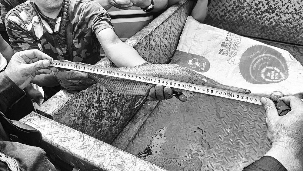 18日上午,工作人員在知音湖中捕獲鱷雀鱔。