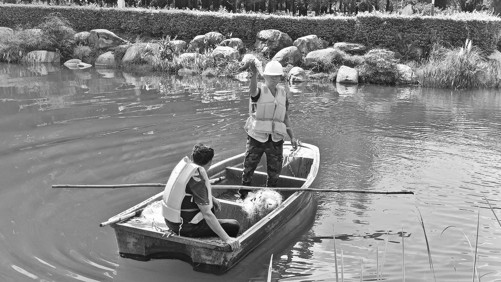 管理公園的玉溪嘉潔物業(yè)有限責任公司負責人介紹,當天共派出8名人員劃船撒網(wǎng),并安排了10名安保人員在岸邊維持秩序,撒下的漁網(wǎng)預計在次日11時左右收網(wǎng)?,F(xiàn)場捕撈人員還不時劃船在湖面往返,用竹竿敲擊水面,試圖驚動“怪魚”撞網(wǎng)。除了撒網(wǎng)捕撈外,還有幾名志愿者在湖邊嘗試誘釣。