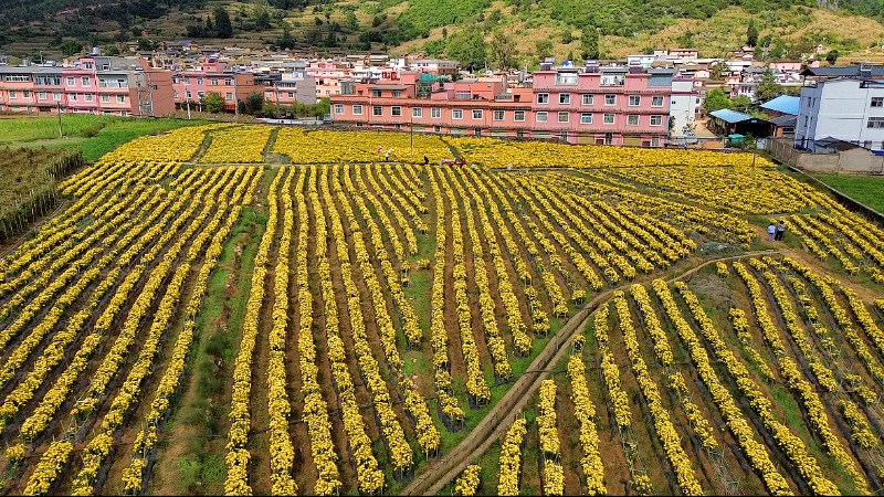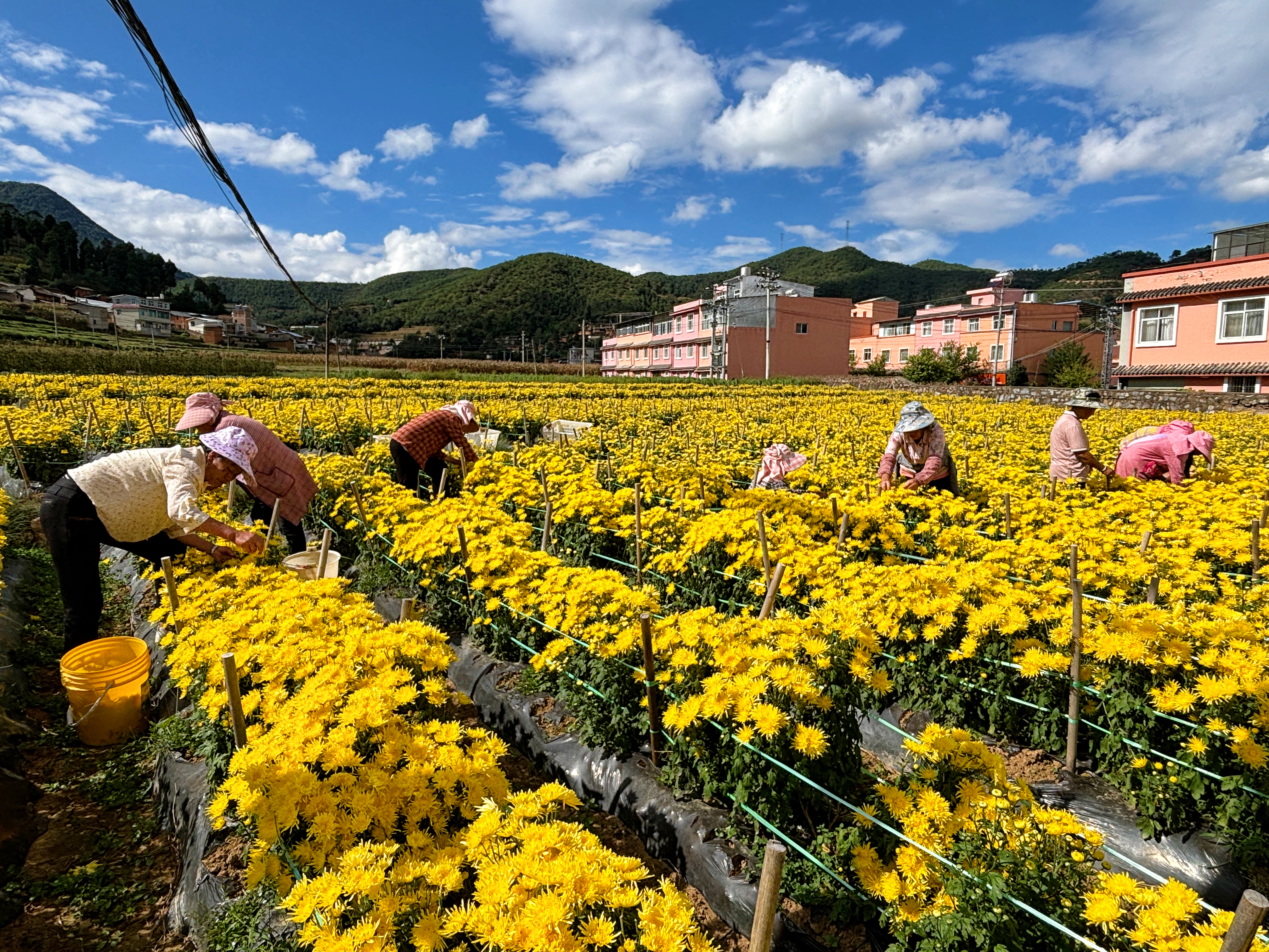 金秋十月,玉溪市易門縣小街鄉(xiāng)的田間地頭洋溢著豐收的喜悅。27畝金絲皇菊競相盛放,金黃的花朵在陽光下熠熠生輝,一壟壟花海連綿成片,菊香彌漫在山間村落,構(gòu)成了一幅動人的田園豐收畫卷。