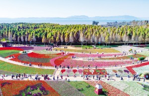 2025年初,游人在昆明撈漁河濕地公園內(nèi)賞郁金香(無人機照片)。 新華社