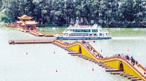 2025年10月1日,一艘游船通過位于滇池草海的東風壩開合浮橋(無人機照片)。 新華社