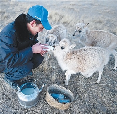 提升生態(tài)系統(tǒng)質(zhì)量和穩(wěn)定性 青海三江源國家公園管理局長江源園區(qū)可可西里管理處索南達(dá)杰保護(hù)站,巡山隊(duì)員給被救助的藏羚羊幼仔喂奶。 新華社記者 張宏祥攝
