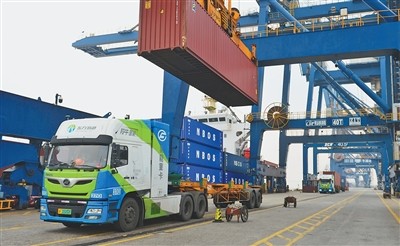 加快發(fā)展方式綠色轉(zhuǎn)型 浙江嘉興立足氫能源領(lǐng)域資源優(yōu)勢,持續(xù)拓展氫能示范“應(yīng)用鏈”。圖為嘉興港乍浦港區(qū),氫能重卡在集裝箱碼頭運(yùn)輸作業(yè)。 人民日?qǐng)?bào)記者 陳 斌攝