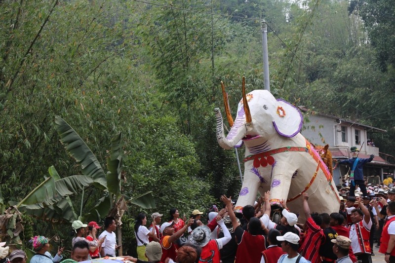 “達(dá)頂”“達(dá)傘”,是滄源佤族群眾對(duì)大象的稱呼,漢語(yǔ)就是“爺爺”“奶奶”的意思。在滄源的班老鄉(xiāng),每年潑水節(jié)后的第三天,當(dāng)?shù)厝罕姸紩?huì)制作大象塑像,開始一年一度的“貢象節(jié)”,這一節(jié)日寄托著阿佤人對(duì)亞洲象的崇敬之情,成為生態(tài)保護(hù)的活教材。