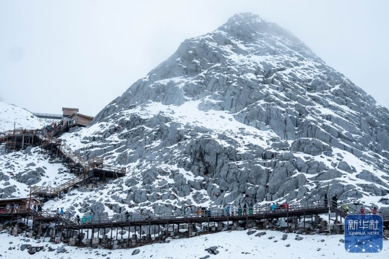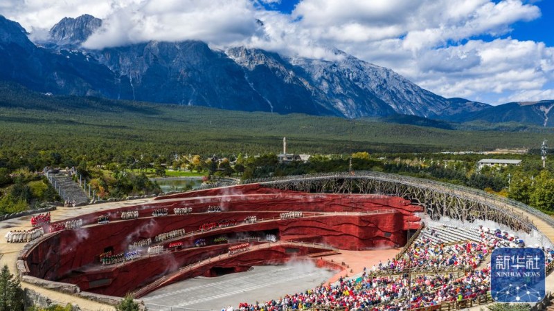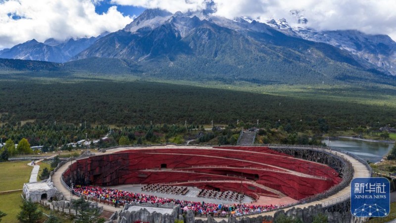 游客在麗江市玉龍雪山景區(qū)觀看《印象麗江》演出(無(wú)人機(jī)照片)。