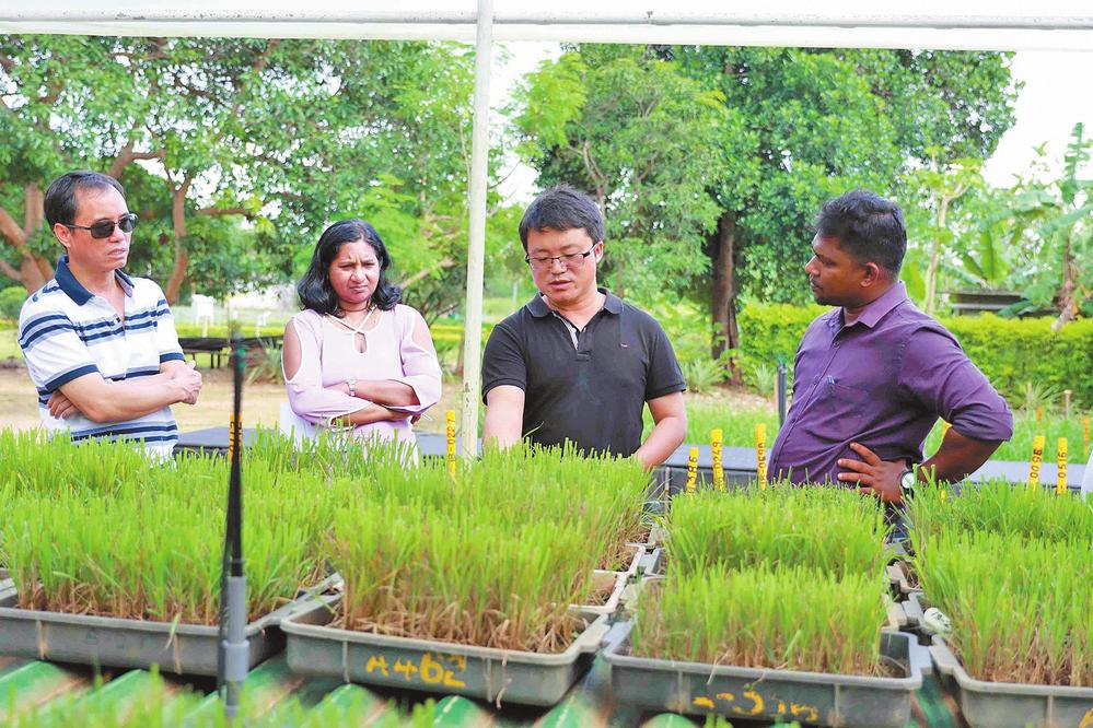 趙培方(左三)與斯里蘭卡育種團隊交流甘蔗育種技術(shù)。 本報通訊員 陸鑫 攝